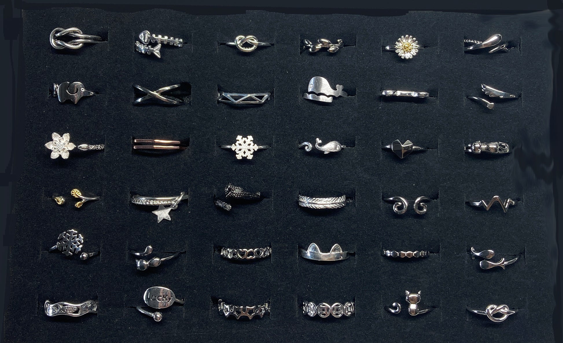 What a great wholesale buy for any store. 36 Sterling silver minimalists rings with a pilfer proof display case. This unit is all set for fast summer sales. Great selection, Great price, all for one low price.